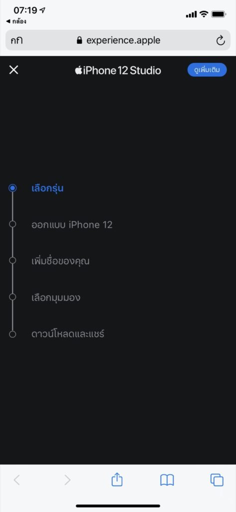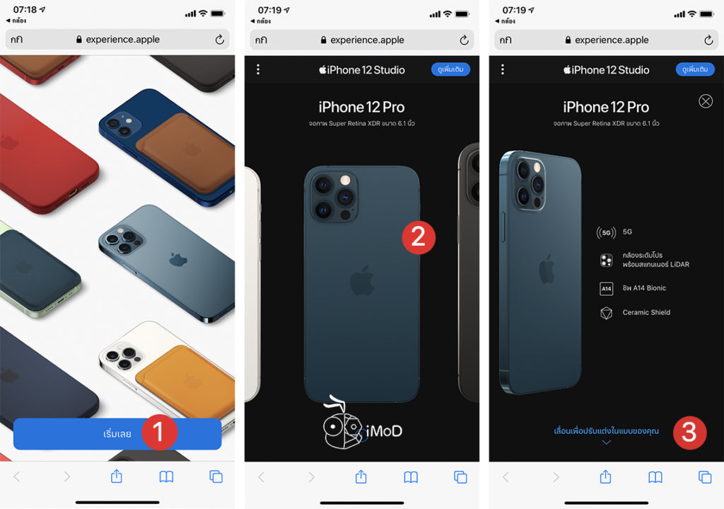 ไปที่เว็บไซต์ iPhone 12 Studio https://experience.apple/iphone/th แนะนำให้เปิดบนมือถือหรือแท็บเล็ต > แตะ เริ่มเลย > เลือกรุ่น iPhone 12 ที่ต้องการ (ตัวอย่างเลือก iPhone 12 Pro) > เลื่อนลงด้านล่าง เพื่อเริ่มปรับแต่ง