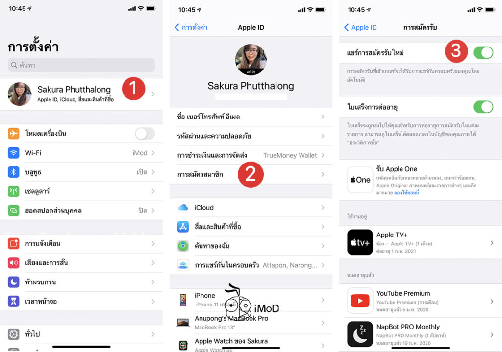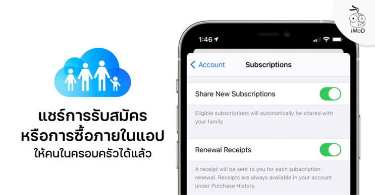 โดยสามารถเปิดให้คนในครอบครัวเข้าถึงการสมัครรับได้ที่ การตั้งค่า (Settings) > Apple ID > การสมัครสมาชิก (Subscribtion) เปิด แชร์การสมัครรับใหม่ (Share New Subscribtions) (หรือจะตั้งค่าใน App Store ก็ได้)