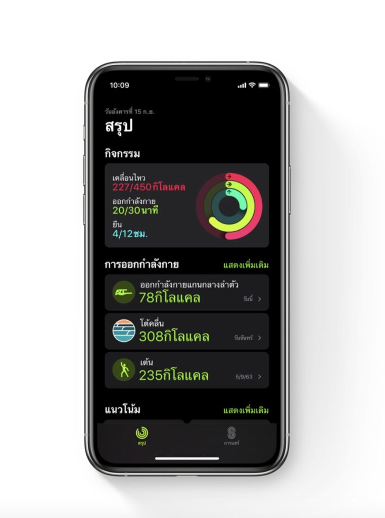 แอปกิจกรรมเปลี่ยนชื่อเป็นแอปฟิตเนส (Fitness) แสดงผลข้อมูลการทำกิจกรรมในหน้าเดียว ดูง่ายกว่าเดิม