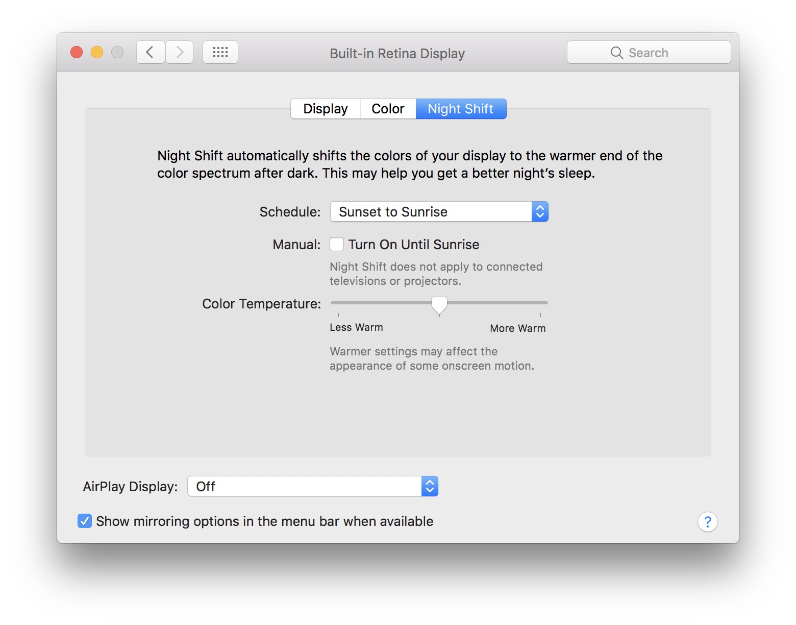 Night Shift เปิดตัวครั้งแรกใน iOS 9.3 โดยระยะเวลาที่ตั้งจะสอดคล้องกับเวลาพระอาทิตย์ตก ในสถานที่เครื่อง Mac กำลังใช้งานอยู่ และนอกจากนี้ผู้ใช้ยังสามารถตั้งค่าเองได้ด้วย โดยจะส่งผลทั้งกับจอหลักและจอต่อภายนอกของเครื่อง