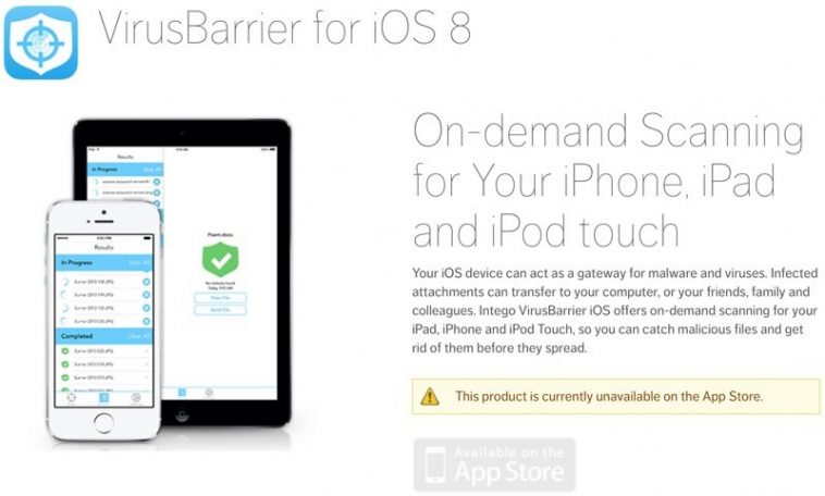 แอปพลิเคชั่น VirusBarrier ซึ่งเป็นแอปสำหรับตรวจสอบไวรัสและมัลแวร์บน iOS (มีของเวอร์ชั่น Mac ด้วย) ล่าสุดถูกนำออกจาก App Store แล้ว เนื่องจาก Apple ต้องการเพิ่มความเชื่อมั่นให้กับลูกค้าว่าระบบของตนนั้นไม่มีไวรัส