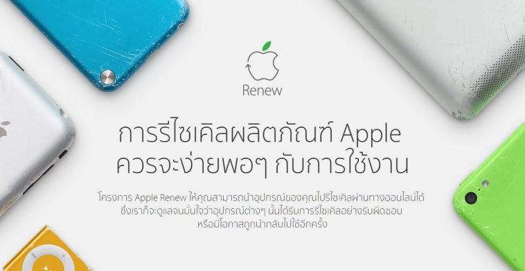 ล่าสุดในประเทศไทยก็สามารถเข้าร่วมโครงการ Apple Renew ได้แล้ว (หรือได้นานแล้วแต่ผมไม่ทราบ) โดยผู้ที่ซื้อสินค้า Apple สามารถนำอุปกรณ์เก่าของตัวเองที่เสียหรือตกรุ่นไปแล้ว เพื่อนำไปกำจัดได้อย่างถูกวิธีและไม่ส่งผลเสียต่อสิ่งแวดล้อม และที่สำคัญคือ ฟรี! โดยเครื่องดังกล่าวจะไม่ถูกเวียนไปซ่อมหรือใช้อีกครั้ง