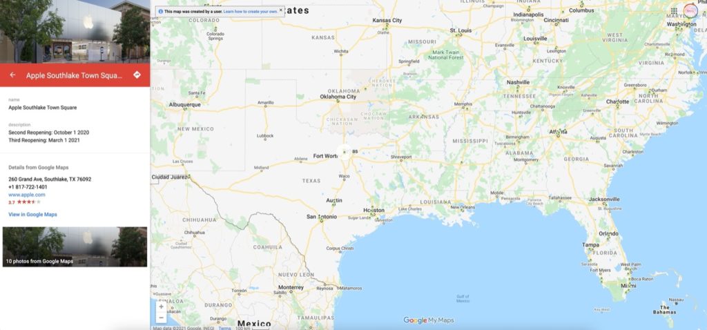 Apple Store บางแห่ง กลับมาเปิดช่วงเดือนพฤษภาคม 2020 แต่ทุกร้านก็ไม่ได้เปิดทำการทั้งหมด อย่างหน้าร้านในเท็กซัส รวมถึงฮิวสตันและแดลลัส ก็ต้องปิดหน้าร้านเนื่องจากประสบปัญหาพายุฤดูหนาว