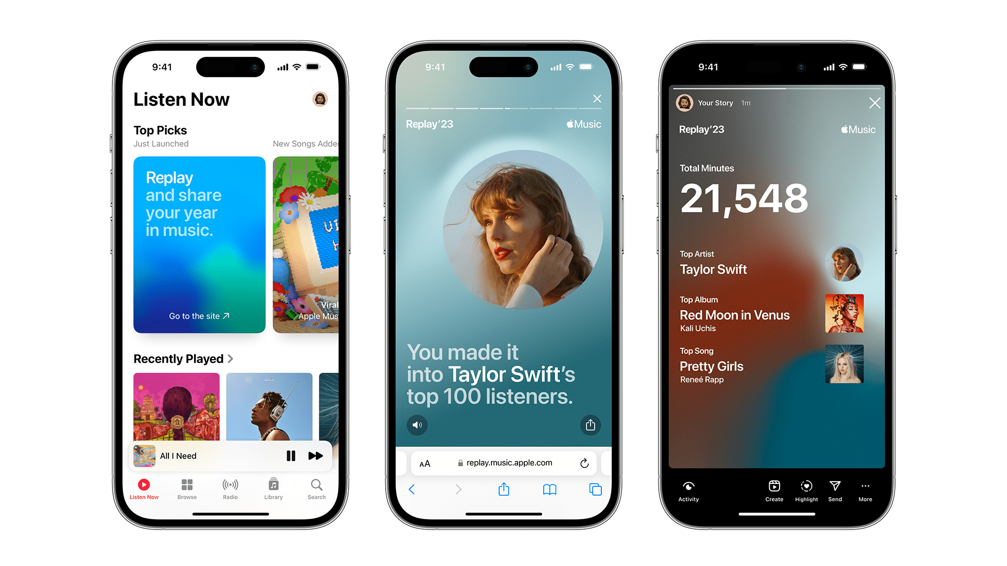 ประสบการณ์ Apple Music Replay 2023 เปิดโอกาสให้ผู้สมัครรับทั่วโลกได้เข้าถึงข้อมูลการฟังและรีลไฮไลต์เฉพาะบุคคล เมื่อลงชื่อเข้าใช้แล้ว ผู้สมัครรับสามารถดูเพลง อัลบั้ม ศิลปิน แนวเพลงยอดนิยมของตนเอง และข้อมูลอื่นๆ อีกมากมาย