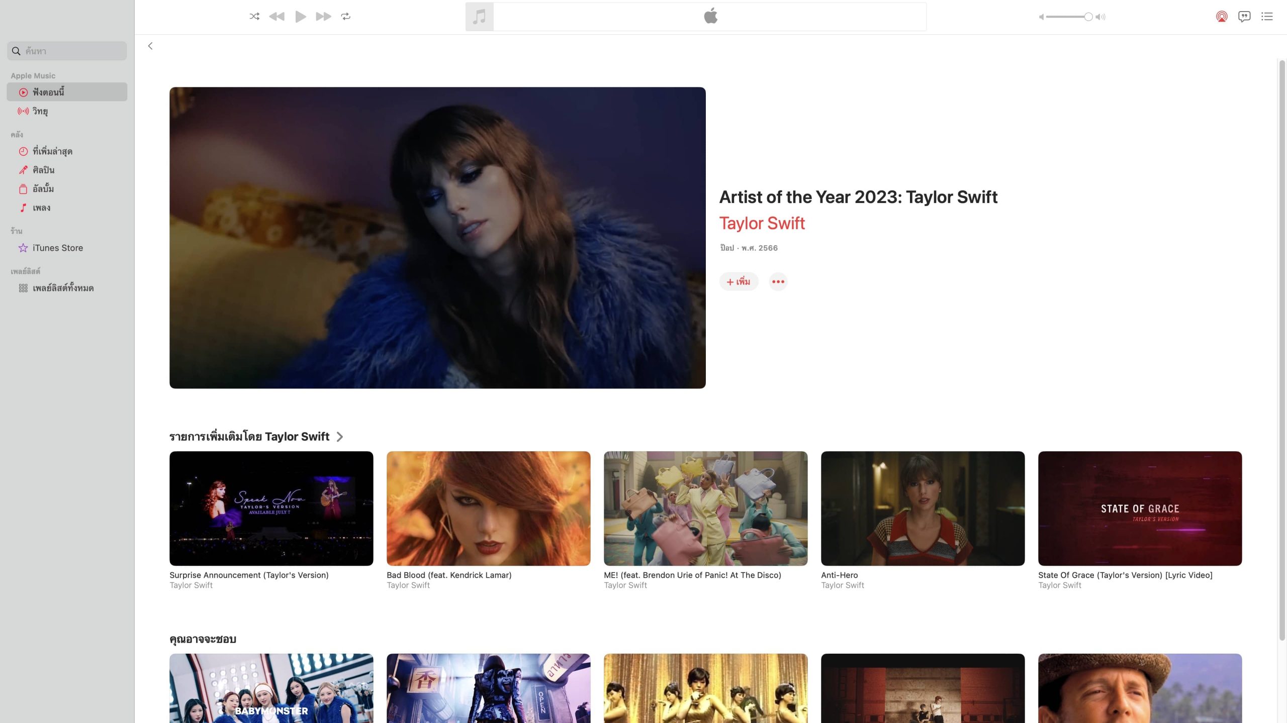 หลังจากสร้างสถิติมากมายในปี 2023 Taylor Swift ได้กลายเป็นศิลปินแห่งปีของ Apple Music โดย Swift ได้สร้างความสุขให้กับผู้คนผ่านงานเพลงและทัวร์คอนเสิร์ตของเธอที่ทำให้เธอพุ่งทะยานกลายเป็นซูเปอร์สตาร์ที่เหนือขั้นไปอีกในปีนี้ โดยในสิบเดือนแรกของ 2023