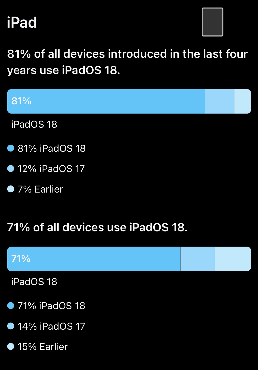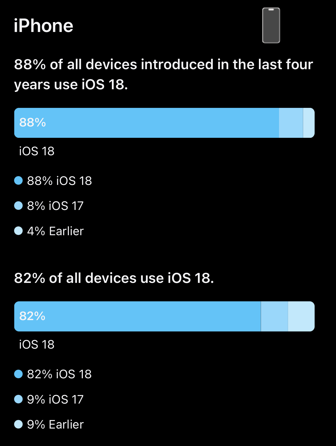 ตัวเลขสัดส่วนยอดผู้ใช้งาน iOS 18, iPadOS 18 เวอร์ชันล่าสุดนี้ยังถือว่าเป็นสัดส่วนที่น่าประทับใจ โดย Apple ให้ข้อมูลไว้เพิ่มเติม ดังนี้