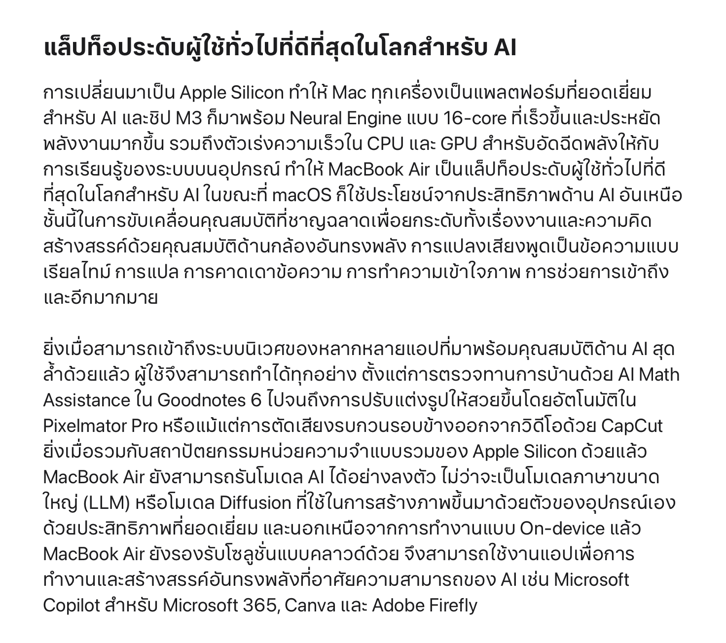 Apple ไม่ได้พูดถึงเรื่อง AI ในการเปิดตัว MacBook Pro ชิป M3 ในเดือน ต.ค. 2023 ที่ผ่านมา แต่กลับมาเขียนอธิบายอย่างโจ่งแจ้งในข้อมูลการเปิดตัว MacBook Air ชิป M3 ครั้งนี้