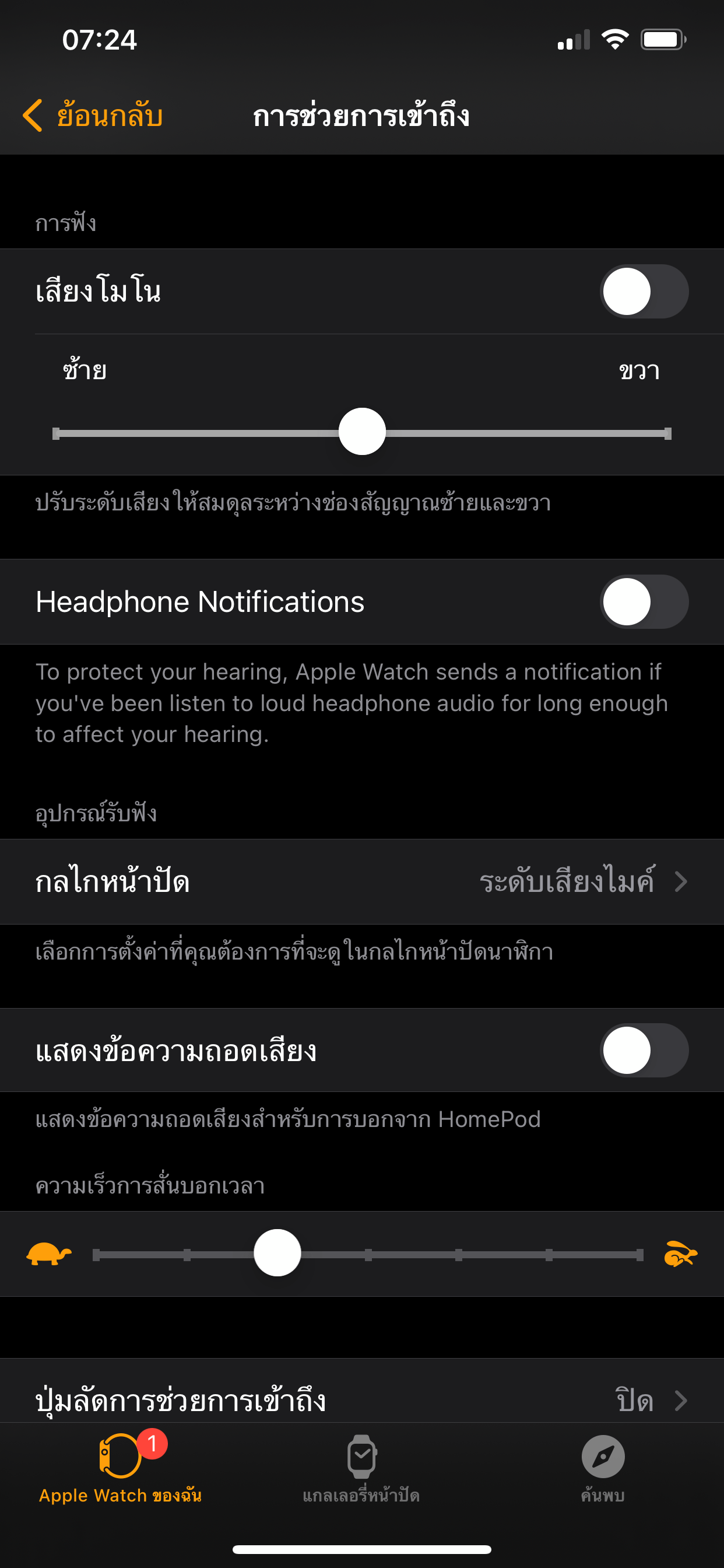 เพิ่มการตั้งค่า Headphone Notifications ในแอป Watch (ในเมนูการช่วยการเข้าถึง)