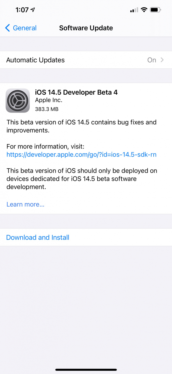 Apple ปล่อย iOS 14.5 Developer Beta 4 ให้นักพัฒนาทดสอบ เน้นแก้ปัญหาและปรับปรุงประสิทธิภาพจากเวอร์ชันก่อนหน้า นักพัฒนาอัปเดตทดสอบได้เลย