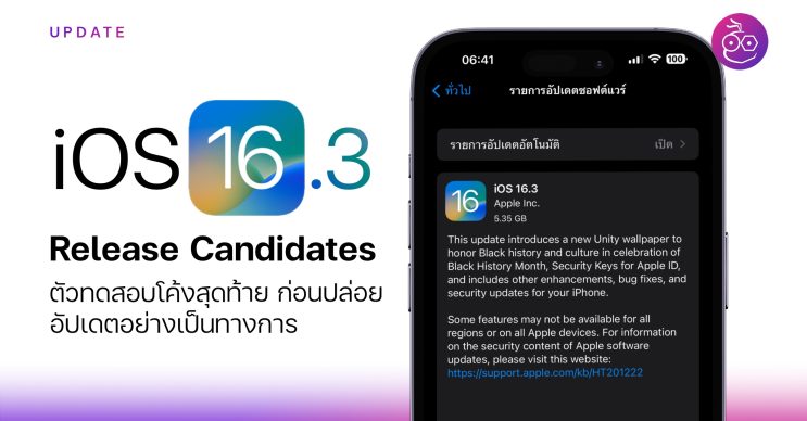 iOS 16.3 ณ ตอนนี้เป็นเวอร์ชันทดสอบแบบ RC ซึ่งเป็นโค้งสุดท้ายของการทดสอบแล้ว คาดว่า Apple จะปล่อย iOS 16.3 เวอร์ชันทางการให้อัปเดตในสัปดาห์หน้า