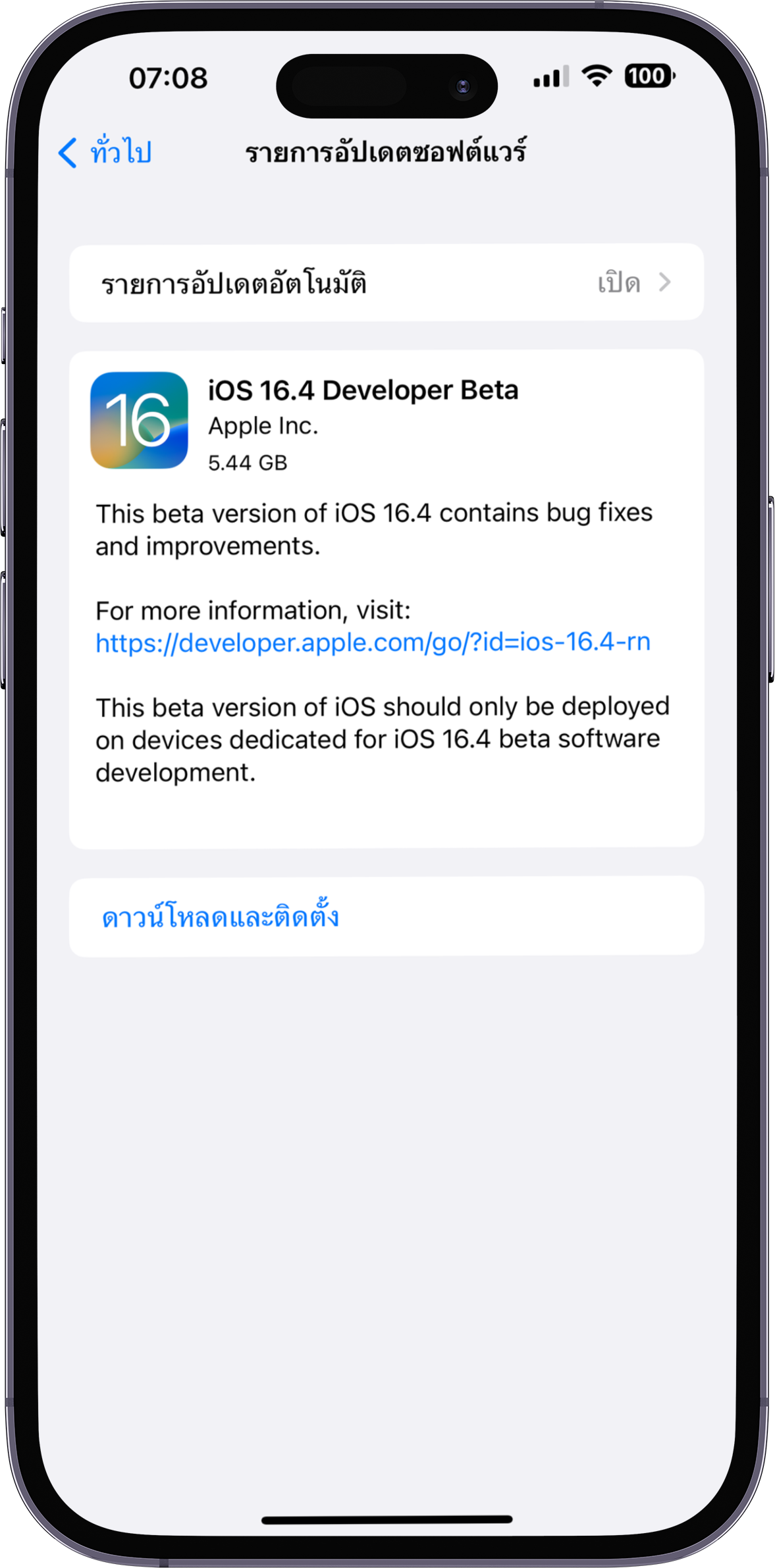 นักพัฒนาที่ลงทะเบียนทดสอบ iOS 16 Developer Beta ไว้กดอัปเดตเพื่อทดสอบ iOS 16.4 Developer Beta 1 ได้เลย นอกจากนั้น Apple ยังปล่อย iPadOS 16.4, watchOS 9.4, macOS 13.3 และ tvOS 16.4 Developer Beta 1 ให้ทดสอบด้วย