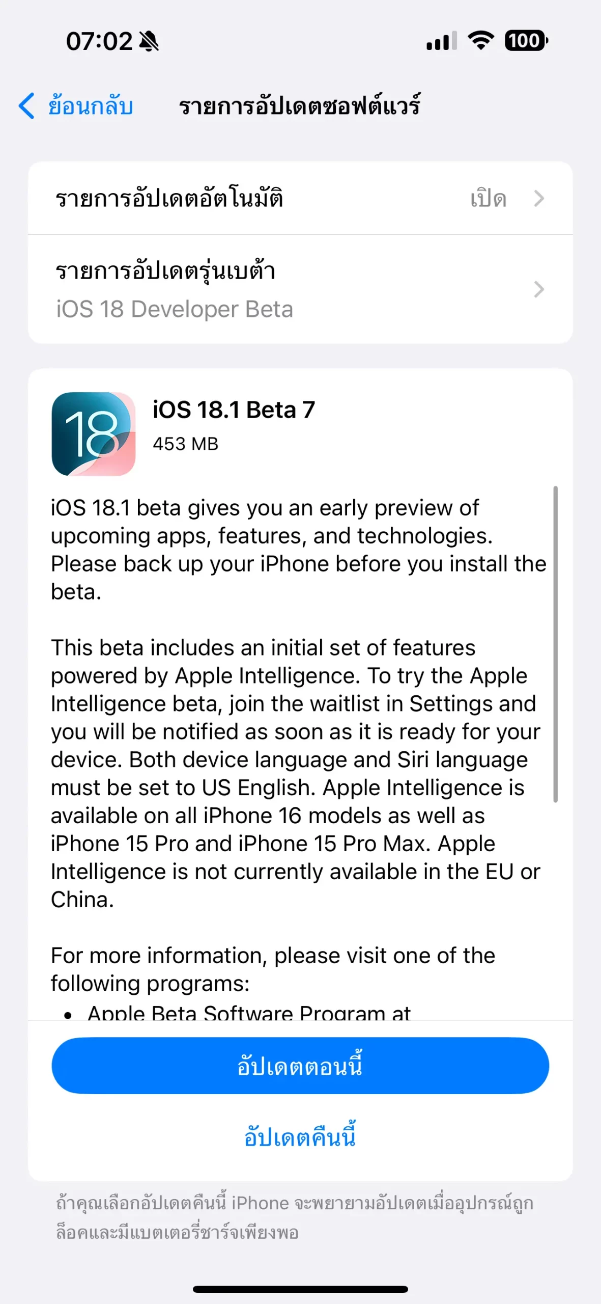 Apple ได้ปล่อย iOS 18.1 Developer Beta 7 ให้ทดสอบ เป็นเวอร์ชันทดสอบท้าย ๆ ก่อน Apple จะปล่อยอัปเดตเวอร์ชันทดสอบ RC