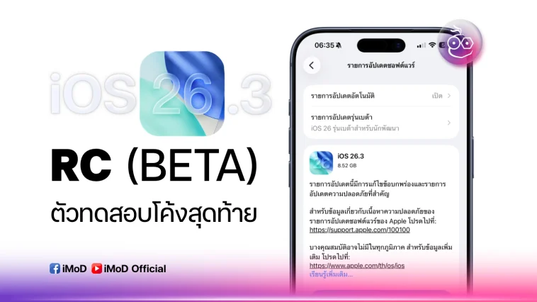 Apple ได้ปล่อยอัปเดต iOS 26.3 RC (Release Candidate) หรือตัวทดสอบโค้งสุดท้ายให้นักพัฒนาทดสอบ ก่อนจะปล่อยอัปเดตตัวเต็มไม่กี่วันหลังจากนี้