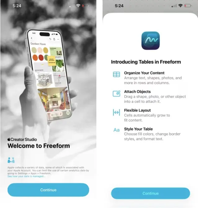แอป Freeform ปรับไปใช้ไอคอนแอปใหม่ และรองรับ Creator Studio สำหรับผู้สมัครใช้งาน Creator Studio ของ Apple โดยผู้สมัครสมาชิกจะเข้าถึง Content Hub ที่รวมเครื่องมือ และสื่อสร้างสรรค์เพิ่มเติมได้ภายในแอป