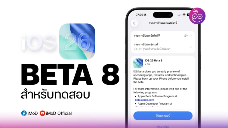 Apple ได้ปล่อย iOS 26 Beta 8 ให้นักพัฒนาทดสอบ อาจเป็นการทดสอบช่วงท้าย ๆ  ซึ่งน่าจะหมายถึงการทดสอบ Beta กำลังจะสิ้นสุดลง