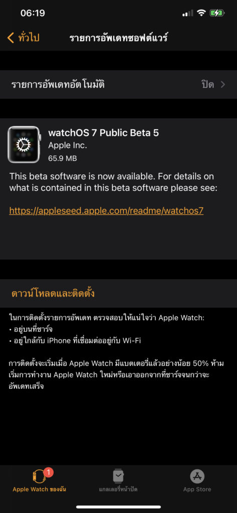 การตั้งค่า (Settings) บน Apple Watch > ทั่วไป (General) > รายการอัปเดตซอฟต์แวร์ (Software Update) หรือจะอัปเดตที่แอป Watch บน iPhone ก็ได้