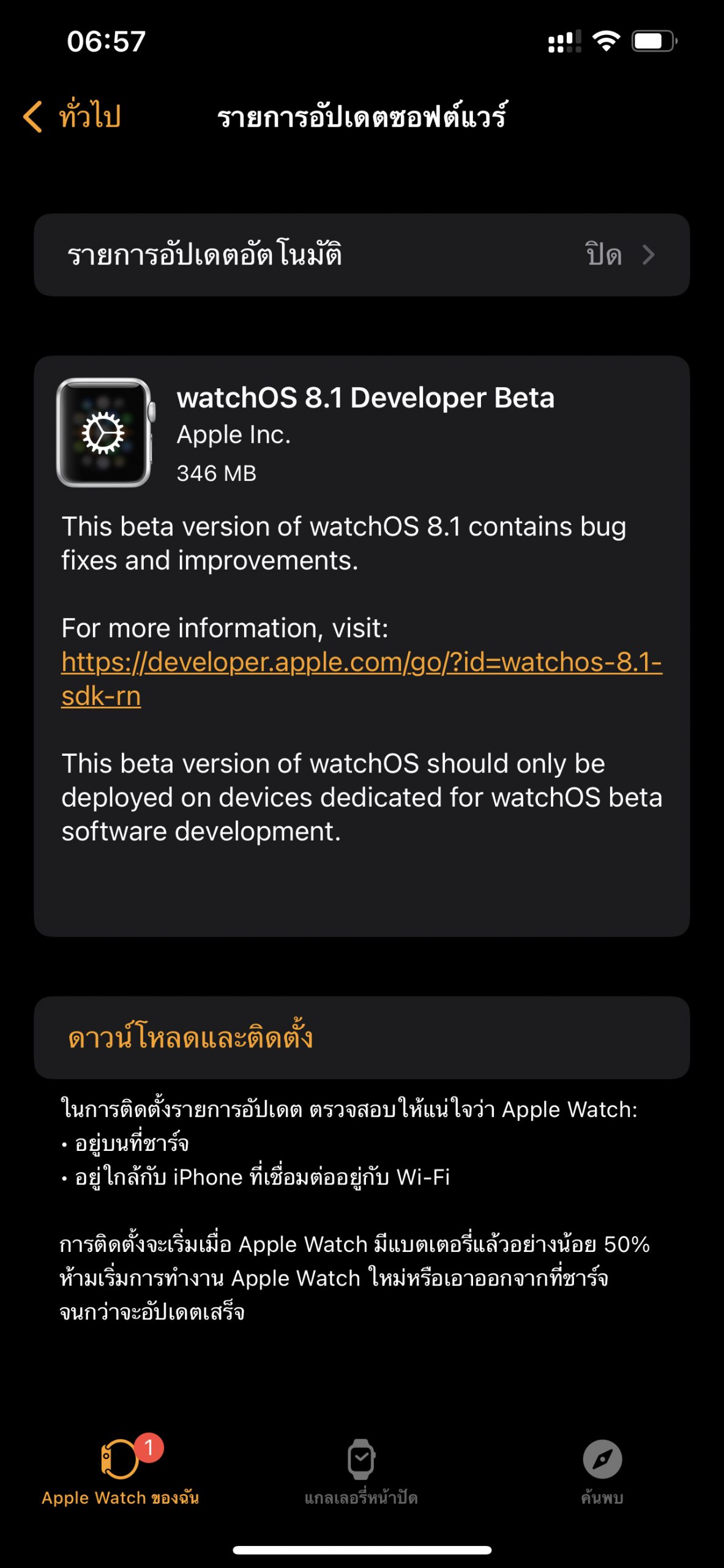 ผู้ลงทะเบียนทดสอบ watchOS 8.1 Beta อัปเดตได้เลยผ่าน Software Update ใน iPhone ที่เชื่อมต่อ, โดยวาง Apple Watch ไว้บนที่ชาร์จตลอดการอัปเดต และแบตต้องมากกว่า 50%
