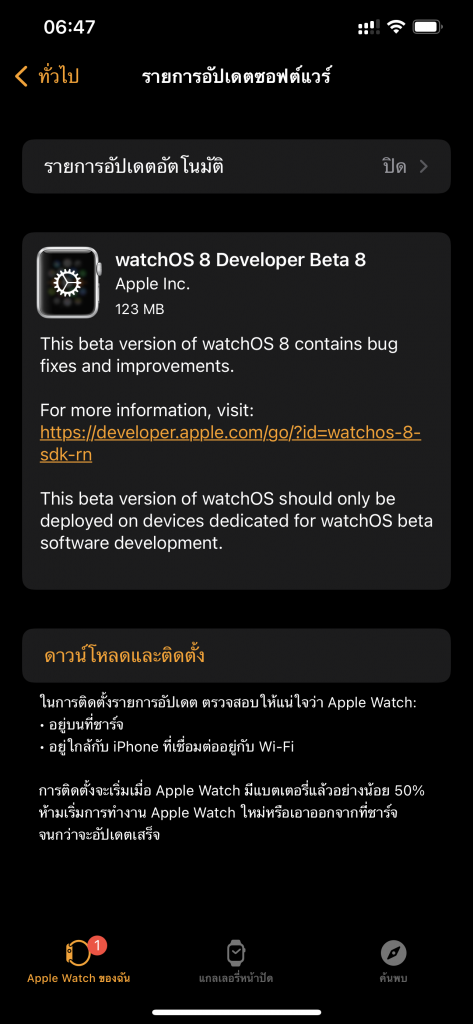 ผู้ลงทะเบียนทดสอบ watchOS 8 Beta อัปเดตได้เลยผ่าน Software Update ใน iPhone ที่เชื่อมต่อ, โดยวาง Apple Watch ไว้บนที่ชาร์จตลอดการอัปเดต และแบตต้องมากกว่า 50%