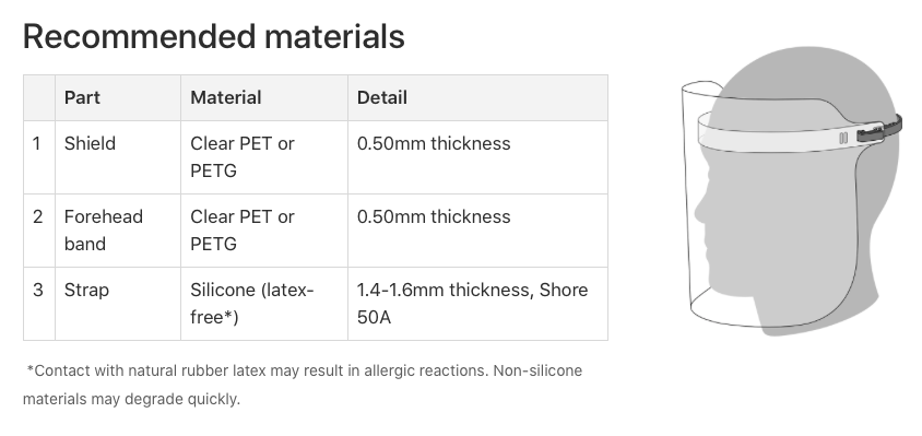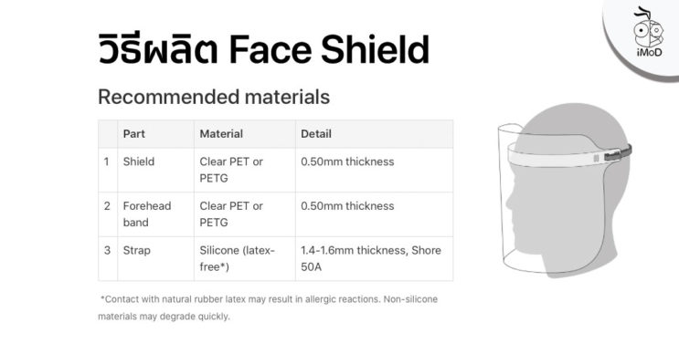 ในเอกสาร Apple ได้ระบุถึงอุปกรณ์ที่ใช้ในยการผลิต วัตถุดิบ และวิธีผลิต Face Shield
