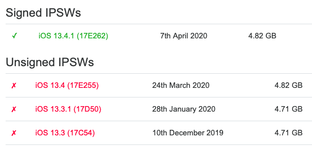 นั่นหมายความว่าผู้ใช้ ไม่สามารถ Downgrade, Signing, Restore หรือติดตั้ง Firmware iOS 13.4 (iPadOS 13.4) ได้ โดยในตอนนี้สามารถติดตั้งได้เพียง iOS 13.4.1 (iPadOS 13.4.1) เวอร์ชันล่าสุดเท่านั้น (17 เมษายน 63)