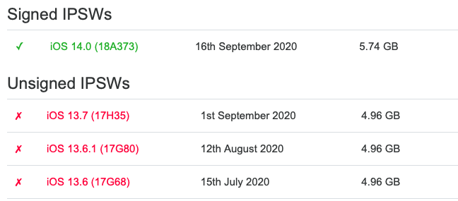 นั่นหมายความว่าผู้ใช้ ไม่สามารถ Downgrade, Signing, Restore หรือติดตั้ง Firmware iOS 13.7 (iPadOS 13.7) ได้ โดยในตอนนี้สามารถติดตั้งได้เพียง iOS 14 (iPadOS 14) เวอร์ชันล่าสุดเท่านั้น (23 ก.ย. 63)