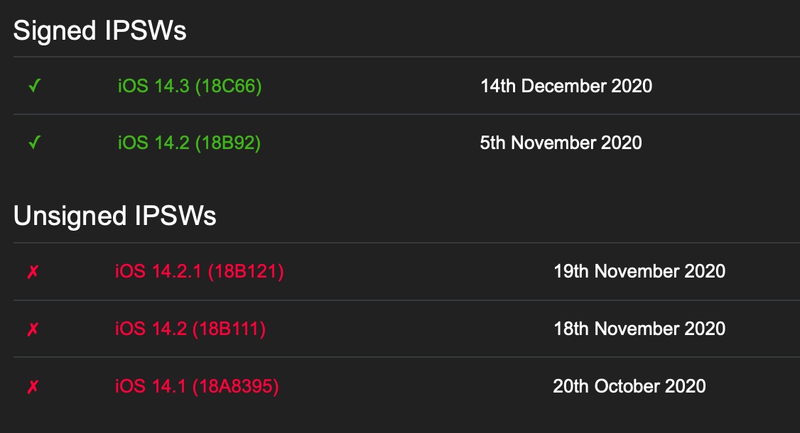 นั่นหมายความว่าผู้ใช้ ไม่สามารถ Downgrade, Signing, Restore หรือติดตั้ง Firmware iOS 14.2.1 (iPadOS 14.2.1) ได้ โดยในตอนนี้สามารถติดตั้งได้เพียง iOS 14.3 (iPadOS 14.3) เวอร์ชันล่าสุดเท่านั้น (8 ม.ค. 64)