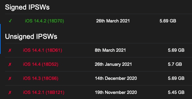 นั่นหมายความว่าผู้ใช้ ไม่สามารถ Downgrade, Signing, Restore หรือติดตั้ง Firmware iOS 14.4.1 (iPadOS 14.4.1) ได้ โดยในตอนนี้สามารถติดตั้งได้เพียง iOS 14.4.2 (iPadOS 14.4.2) เวอร์ชันล่าสุดเท่านั้น (3 เม.ย. 64)