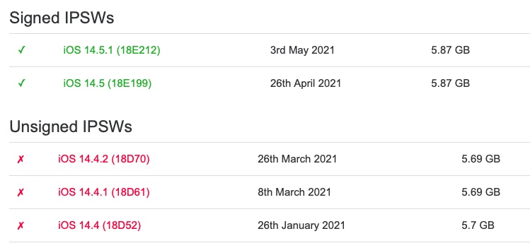 นั่นหมายความว่าผู้ใช้ ไม่สามารถ Downgrade, Signing, Restore หรือติดตั้ง Firmware iOS 14.4.2 (iPadOS 14.4.2) ได้ โดยในตอนนี้สามารถติดตั้งได้เพียง iOS 14.5 (iPadOS 14.5) และ iOS 14.5.1 (iPadOS 14.5) เท่านั้น (4 พ.ค. 64)