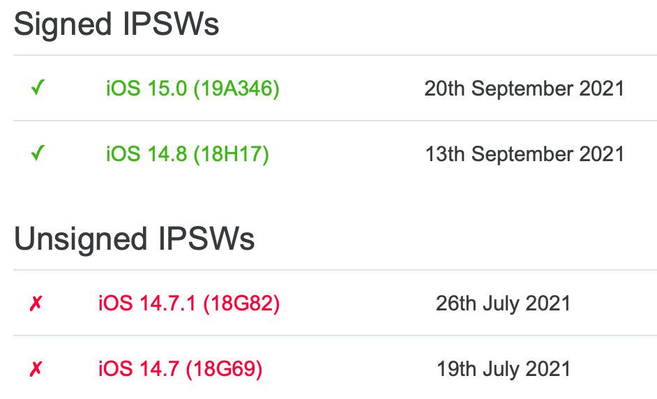 นั่นหมายความว่าผู้ใช้ ไม่สามารถ Downgrade, Signing, Restore หรือติดตั้ง Firmware iOS 14.7 (iPadOS 14.7.1) ได้ โดยในตอนนี้สามารถติดตั้งได้เพียง iOS 14.8, iOS 15 ท่านั้น (22 ก.ย. 64)