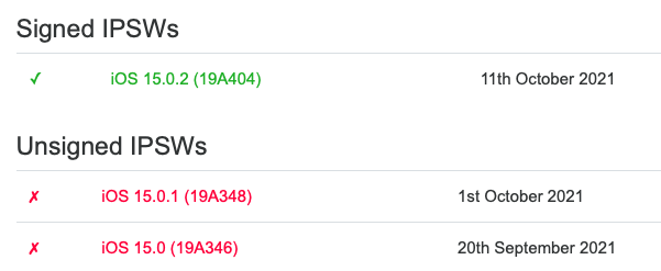 นั่นหมายความว่าผู้ใช้ ไม่สามารถ Downgrade, Signing, Restore หรือติดตั้ง Firmware iOS 15.0.1 (iPadOS 15.0.1) ได้ โดยในตอนนี้สามารถติดตั้งได้เพียง iOS 15.0.2 เท่านั้น (19 ต.ค. 64)