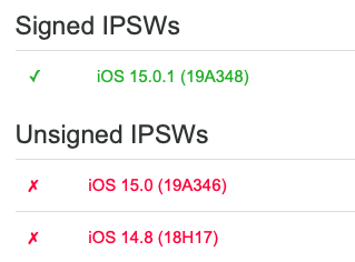 นั่นหมายความว่าผู้ใช้ ไม่สามารถ Downgrade, Signing, Restore หรือติดตั้ง Firmware iOS 15.0 (iPadOS 15.0) ได้ โดยในตอนนี้สามารถติดตั้งได้เพียง iOS 15.0.1 เท่านั้น (9 ต.ค. 64)