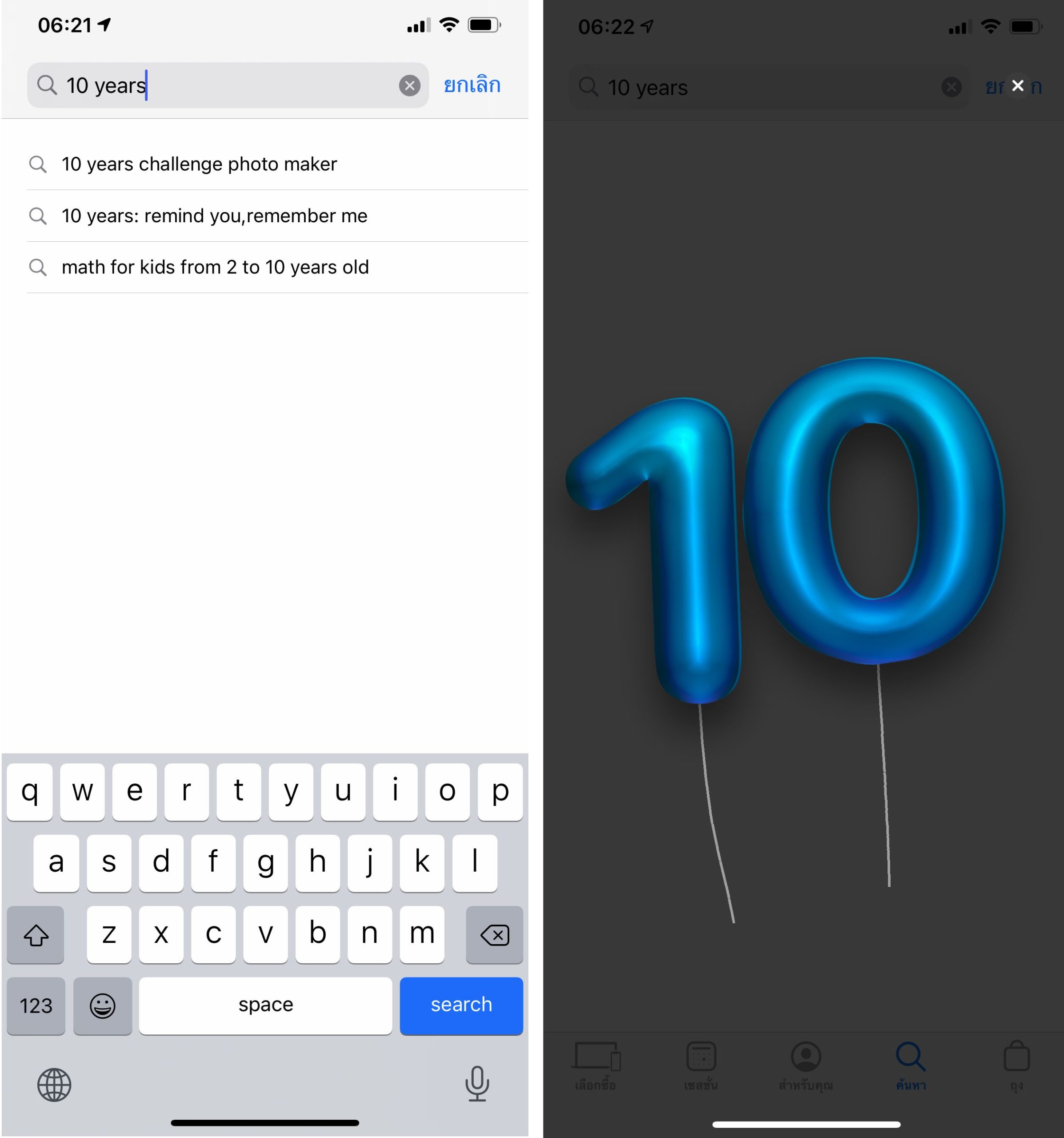สำหรับ Ester Egg เอฟเฟกต์บอลลูนนั้นทำได้ง่าย ๆ โดยเปิดแอป Apple Store > แตะที่การค้นหา > พิมพ์ “10 years” แล้วค้นหา เพียงเท่านี้ก็จะมีเอฟเฟกต์บอลลูนเลข 10 แสดงแล้ว
