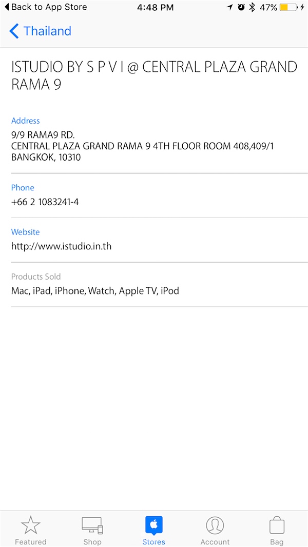 3. Stores เมนูนี้สำหรับการค้นหา Apple Store ที่อยู่ในบริเวณที่ใกล้เคียงว่ามีสาขาตั้งอยู่ที่ไหนพร้อมแจ้งเบอร์ติดต่อไว้ ส่วนหากประเทศใดยังไม่มี Apple Store (อย่างเช่นไทย) ก็สามารถที่จะค้นหาตัวแทนจำหน่ายได้