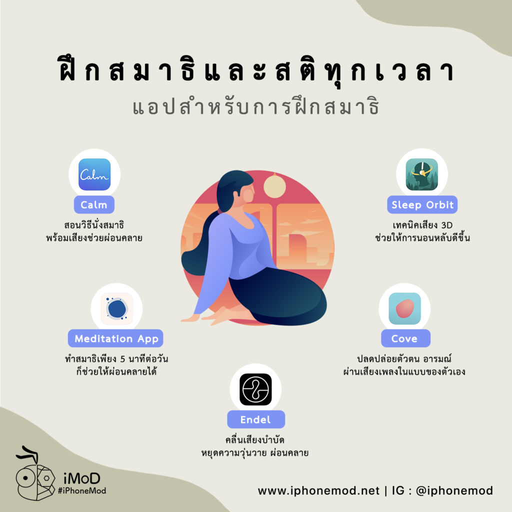 - Meditation App – ใช้เวลาเพียง 5 นาทีต่อวัน ก็สามารถช่วยลดความเครียด นอนหลับง่ายขึ้น รวมถึงมีสมาธิดีกว่าเดิม โดยในแอปจะมีโหมดต่าง ๆ ให้เลือก เพื่อให้ตอบสนองกับอารมณ์ของคุณในแต่ละวันได้ดีที่สุด