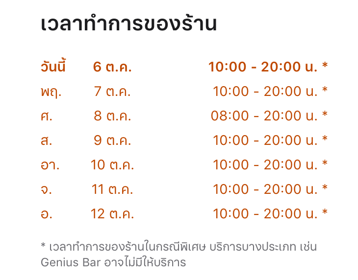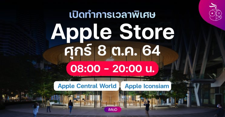 Apple อัปเดตข้อมูลเวลาเปิดทำการพิเศษในวันที่ 8 ต.ค. 64 โดยหน้าร้าน Apple Central World, Apple Iconsiam จะเปิดทำการ 8:00 น. เพื่อเปิดขาย iPhone 13