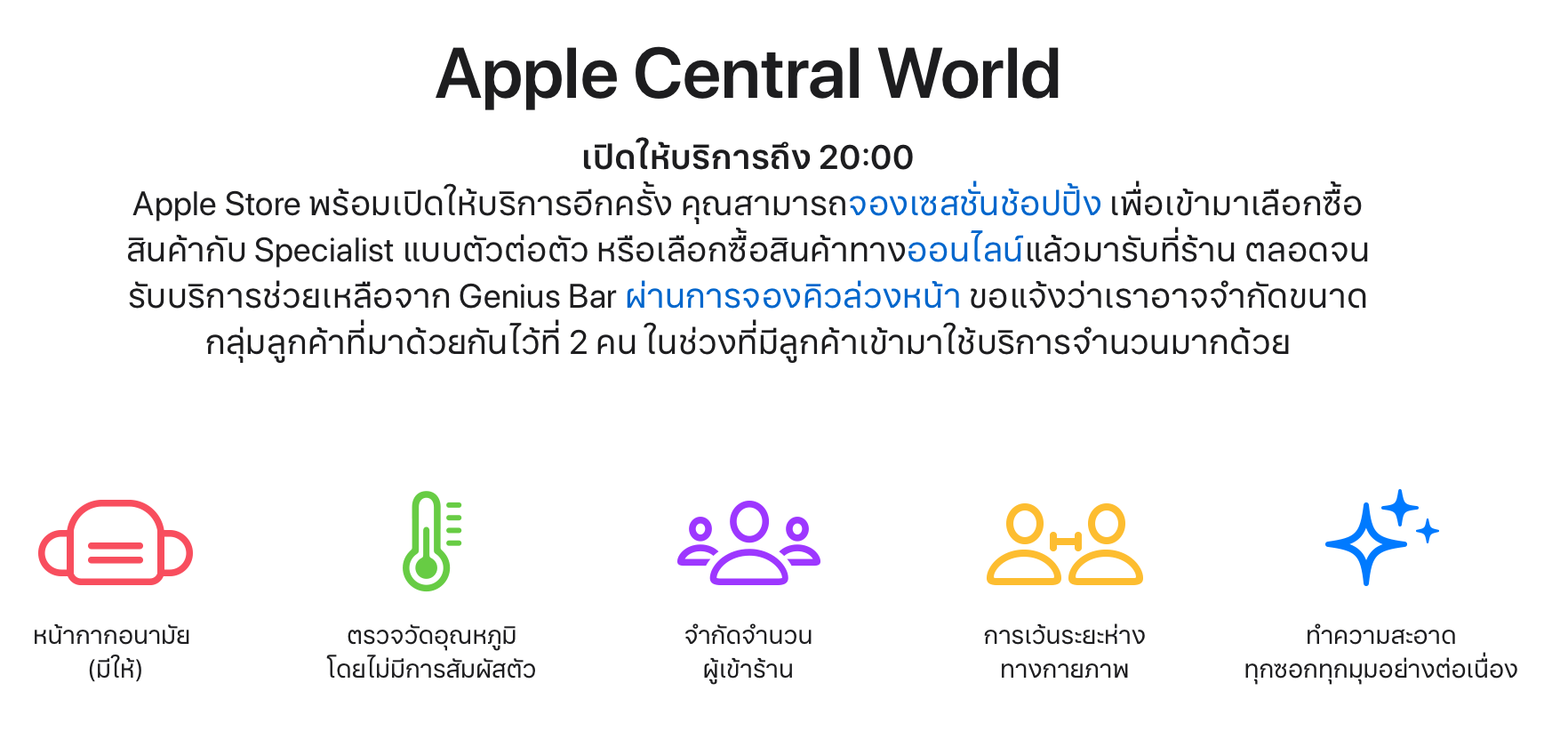 ที่หน้าร้าน Apple Central World, Apple Iconsiam มีมาตรการด้านสุขภาพ ลูกค้าควรปฏิบัติตามอย่างเคร่งครัด