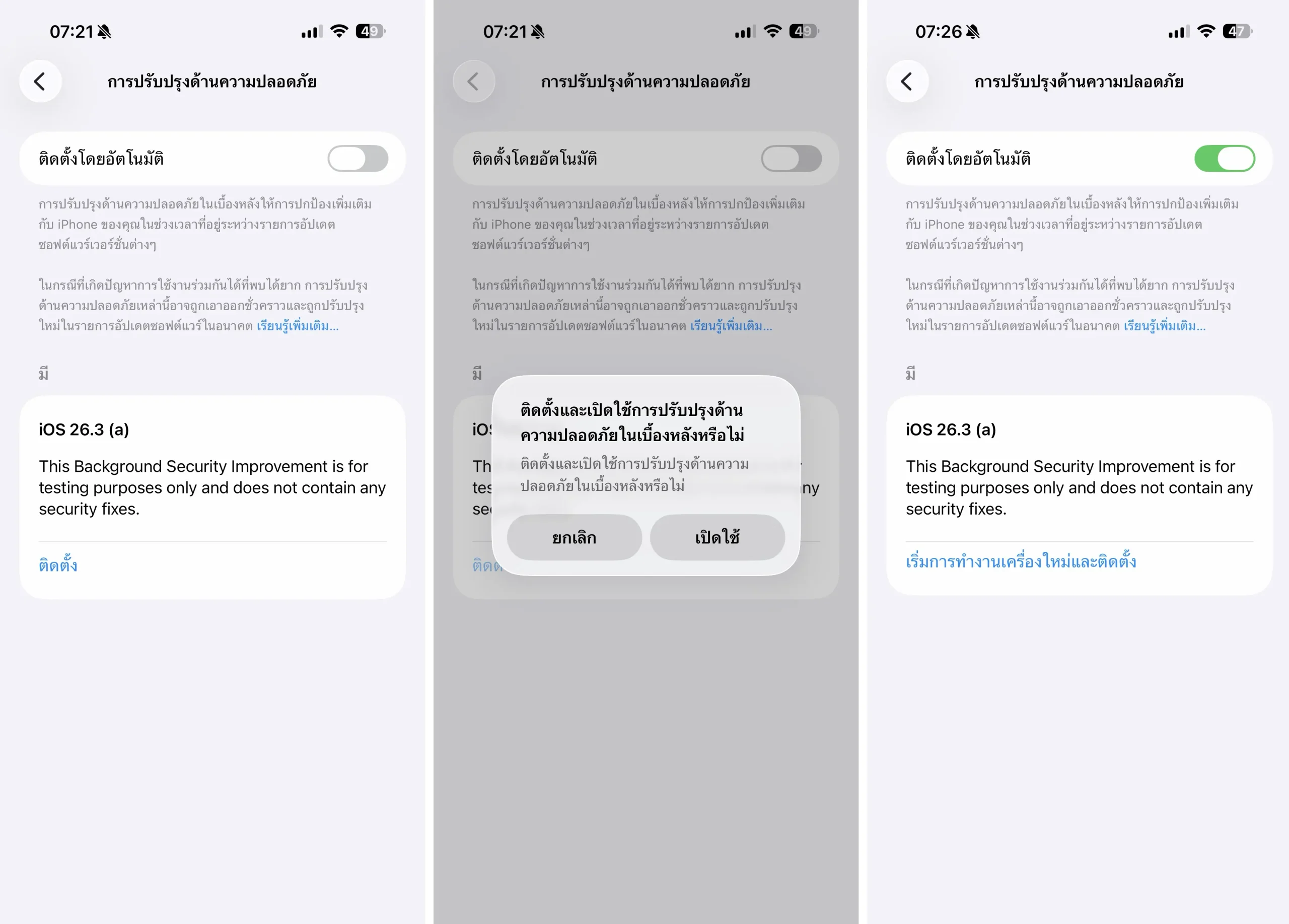 Apple ทดสอบฟีเจอร์ Background Security Improvement สำหรับอัปเดตด้านความปลอดภัยในเบื้องหลัง ซึ่งเริ่มเปิดใช้ใน 26.1 และกำลังเปิดให้ทดสอบใน iOS, iPadOS และ macOS เวอร์ชัน 26.3