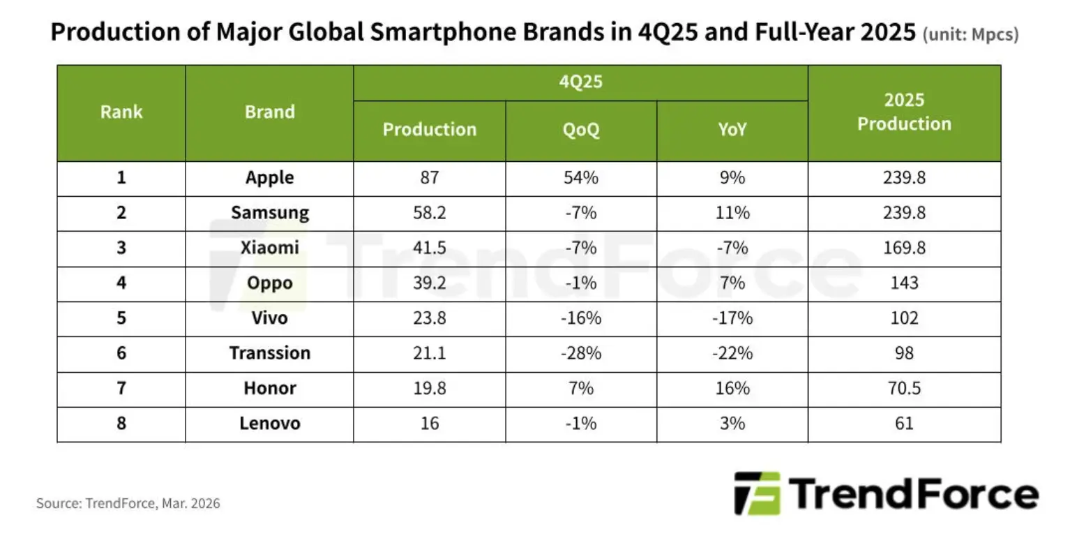 TrendForce ระบุว่าในปี 2025, Apple และ Samsung ผลิตสมาร์ตโฟนได้ในปริมาณใกล้เคียงกัน ส่งผลให้ทั้งสองบริษัทครองตำแหน่งสูงสุดในการผลิตสมาร์ตโฟนทั่วโลก