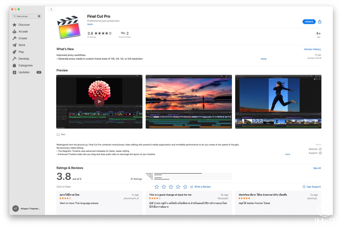 ผู้ใช้เดิมสามารถอัปเดต Final Cut Pro เป็นเวอร์ชันล่าสุด เวอร์ชัน 10.4.9 ได้แล้ววันนี้ สำหรับใครที่ต้องการใช้งานก็สามารถดาวน์โหลดซื้อแอปได้ที่ Mac App Store ในราคา 8,900 บาท สำหรับนักศึกษาซื้อได้ในราคา 5,900 บาท ทดลองใช้งาน https://www.apple.com/th/final-cut-pro/trial/ รายละเอียดเพิ่มเติมที่ apple.com/th/final-cut-pro