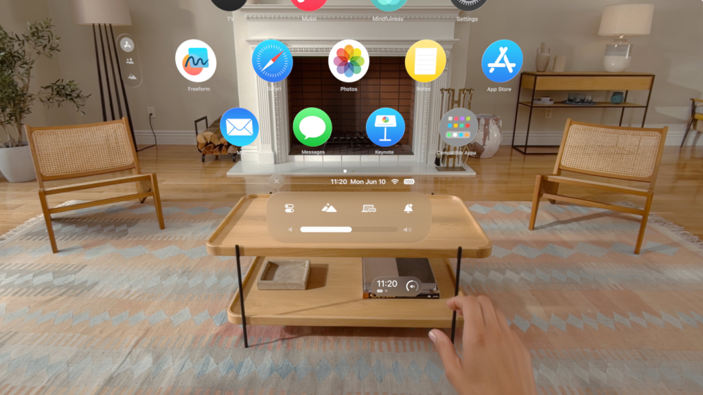 ใช้มือควบคุมเพื่อเข้าสู่ “มุมมองหน้าแรก” (Home View) และสามารถดูวันที่และเวลา ปรับระดับเสียง หรือแม้กระทั่งตรวจสอบระดับแบตเตอรี่ อีกทั้งยังสามารถเปิด “แถบควบคุม” (Control Center) เพื่อเข้าถึงฟีเจอร์ที่ใช้บ่อยได้อย่างรวดเร็ว เช่น การแจ้งเตือน, การแสดงผล Mac บนหน้าจอ (Mac Virtual Display) และอื่นๆอีกมากมาย