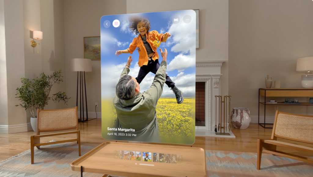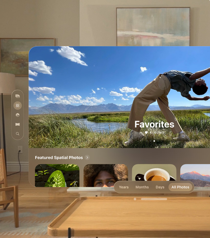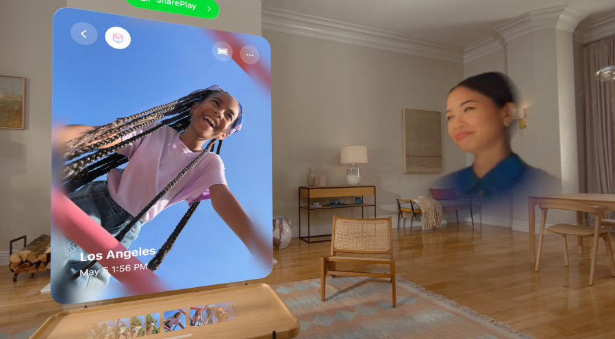 ขณะที่โทร FaceTime กับเพื่อน หรือครอบครัว ผู้ใช้สามารถแบ่งปัน และโต้ตอบกับภาพถ่าย วิดีโอ และภาพพาโนรามาเชิงพื้นที่ในระดับจริงได้ โดยทุกคนใช้ Apple Vision Pro ดังนั้นคุณจึงสามารถหวนคิดถึงความทรงจําได้ ไม่ว่าจะอยู่ที่ไหนก็ตาม