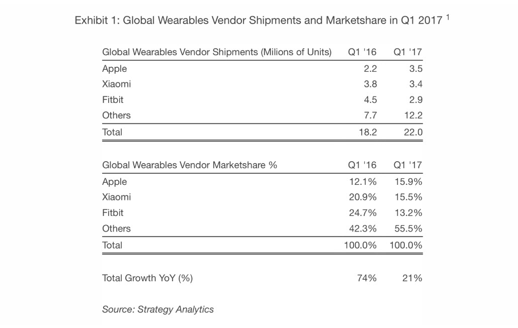 Strategy Analytics ได้รายงานผลสำรวจตลาดอุปกรณ์สวมใส่ (Wearables) หรือ Smart Watch, Smart Band พบว่าในไตรมาสที่ 1 ปี 2017 Apple สามารถจำหน่ายอุปกรณ์สวมใส่และครองส่วนแบ่งตลาดเป็นอันดับ 1 แซงหน้า Xiaomi และ Fitbit