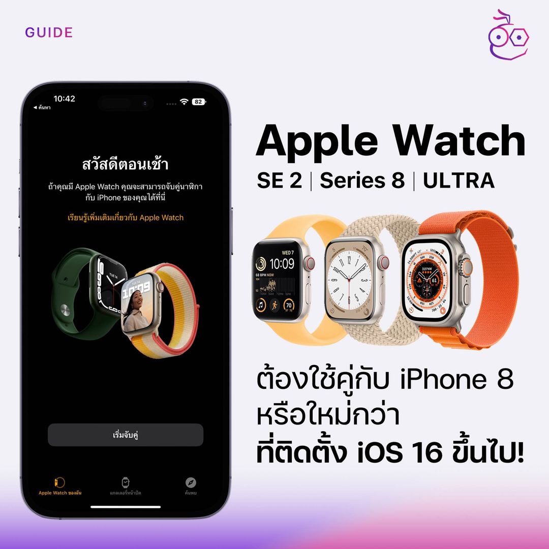 ก่อนที่จะซื้อ Apple Watch แนะนำให้ตรวจสอบอุปกรณ์ และ เวอร์ชันล่าสุดของซอฟแวร์ที่รองรับดูก่อน เพราะหากใครใช้ iPhone 6s, iPhone 7 อยู่ แล้วอยากซื้อ Apple Watch รุ่นใหม่ปี 2565 มาจับคู่ใช้งาน ก็อาจต้องถอย iPhone เครื่องใหม่ด้วย เพราะ Apple Watch SE 2, Series 8 และ Ultra ต้องจับคู่กับ iPhone รุ่นรองรับ iOS 16 ขึ้นไป