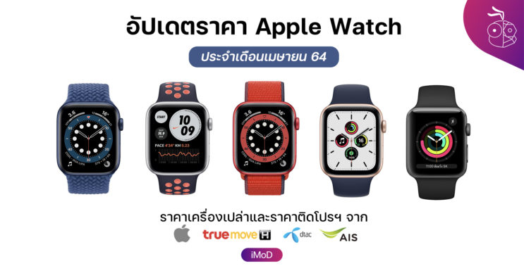 ข้อมูลนี้จะแสดงราคา Apple Watch Series 3, Series 6 และ Apple Watch SE ที่วางจำหน่าย ณ ปัจจุบัน มีทั้งราคาเครื่องเปล่าและราคาที่ถูกสุดที่มาพร้อมแพ็กเกจของแต่ละเครือข่าย คือ Apple, TrueMove H, AIS, DTAC (ไม่รวมร้านค้าอื่นๆ นอกจากนี้) ประจำเดือนเมษายน 2564 สามารถดูรายละเอียดเพิ่มเติมได้เลย