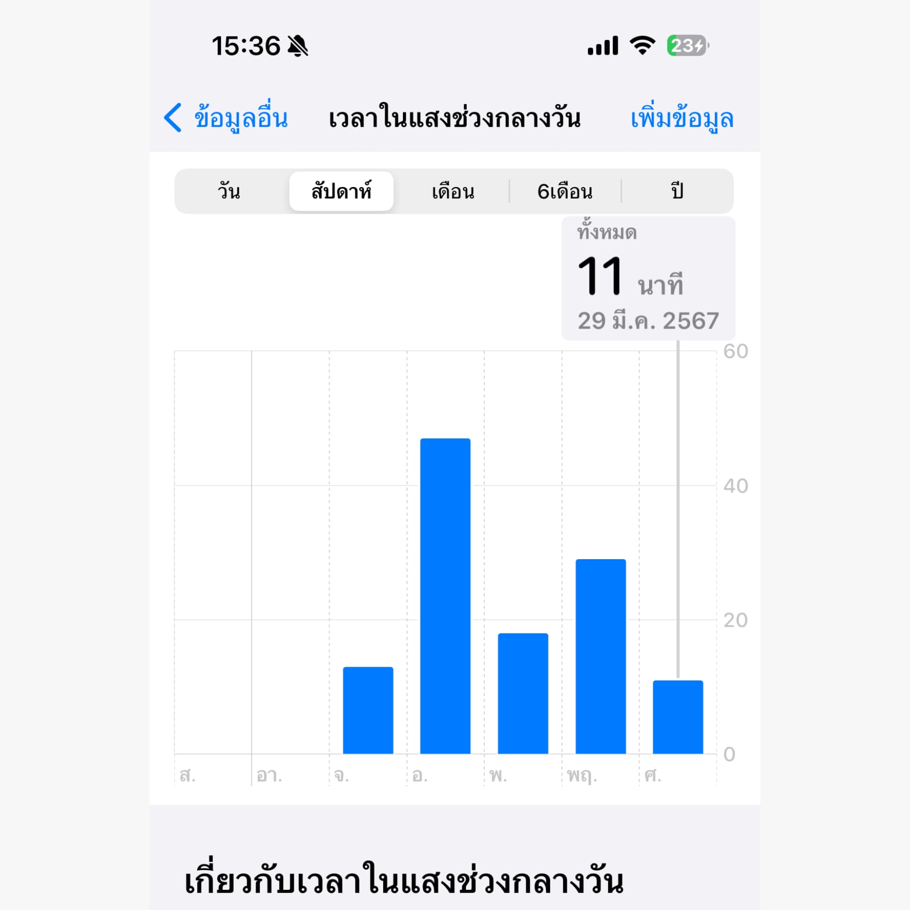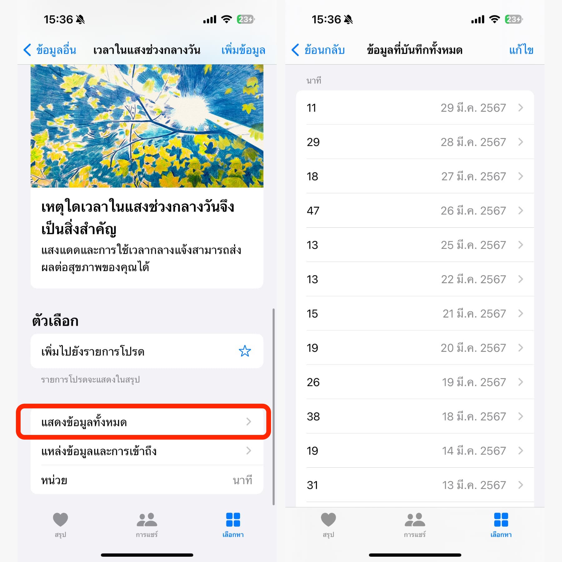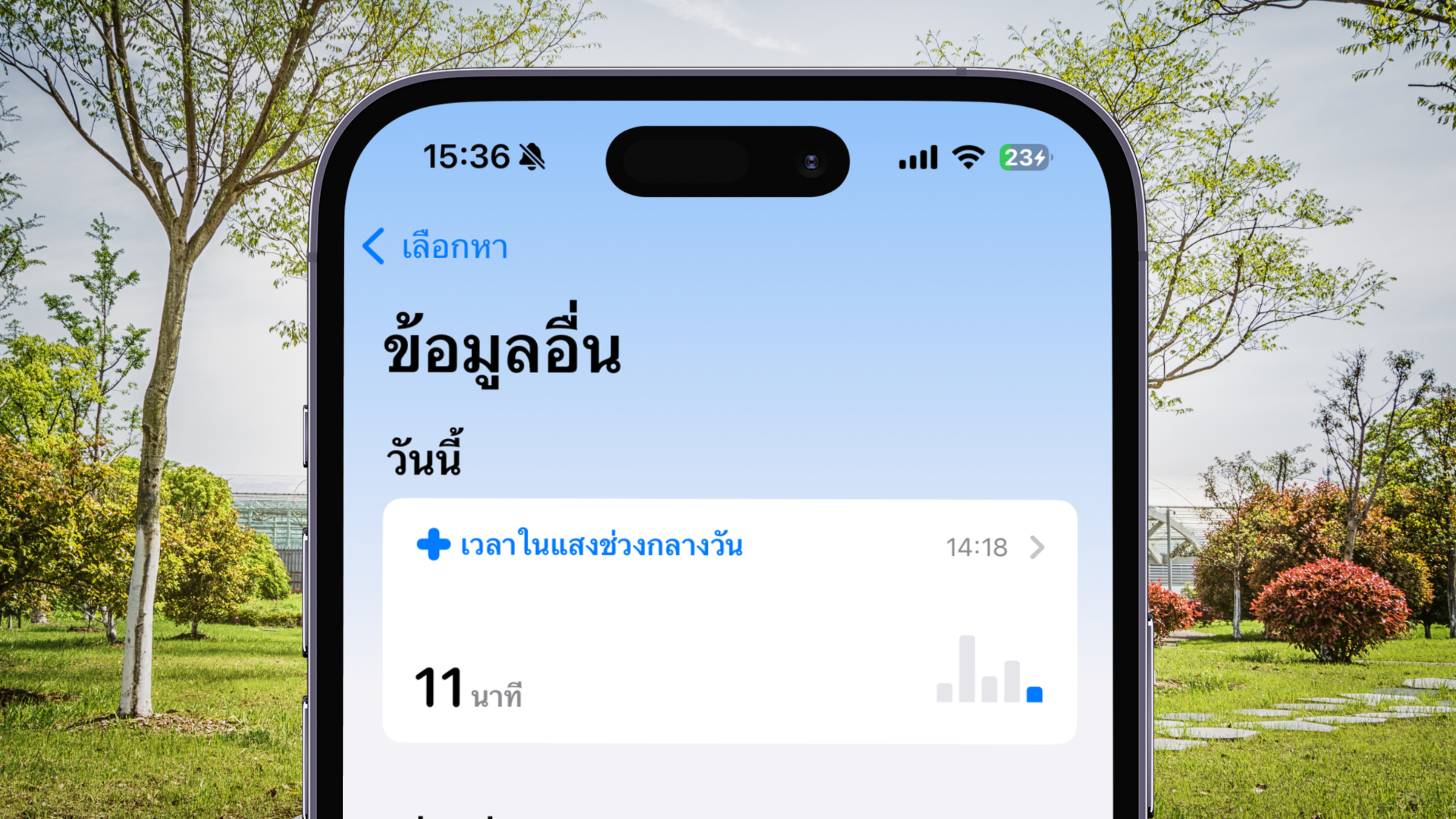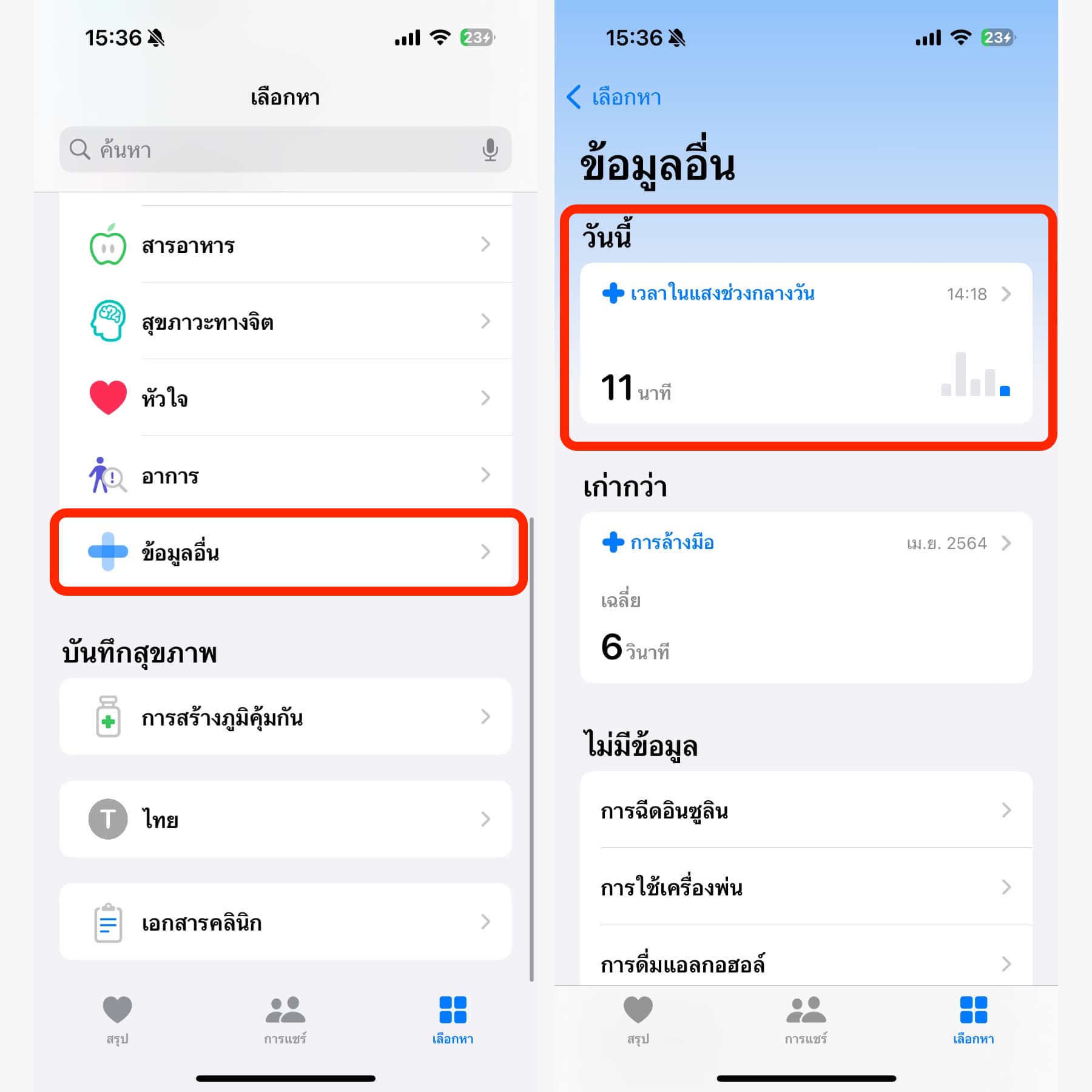 เข้าไปที่แอปสุขภาพบน iPhone > ไปที่เมนู เลือกหา > เลือก “ข้อมูลอื่น” จากนั้นให้ลองเข้าไปดูในฟีเจอร์ที่ชื่อว่า “เวลาในแสงช่วงกลางวัน”