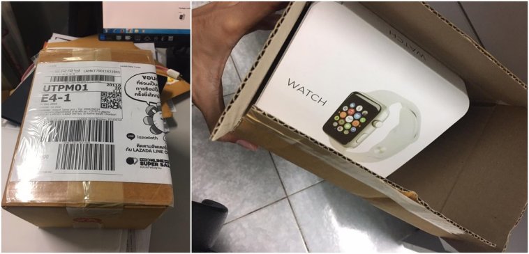 ลูกค้ารายหนึ่งได้สั่งสินค้า Apple Watch จากทาง Lazada ในราคา 6,990 บาท (ลดจากราคาเต็ม 12,900 บาท) ด้วยอารมณ์สองจิตสองใจว่าจะเป็นของแท้หรือไม่ และเมื่อได้สินค้าก็พบว่าเป็นของปลอม จากเท่าที่ทางทีมงานได้สืบมาทราบว่า ราคานี้ถึงแม้จะเป็นของปลอมก็ยังแพงไปมากอยู่ดี