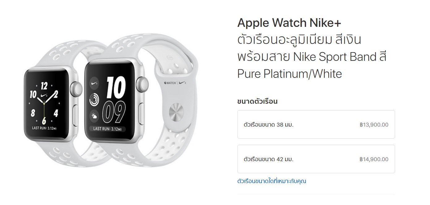 สำหรับสาย Nike Sport Band ทั้ง 3 สีรองรับ Apple Watch ตัวเรือน 38 มม. และ 42 มม. โดยสายมี 2 ขนาดคือ S/M (สำหรับขนาดข้อมือ 130–200 มม.) และ M/L (สำหรับขนาดข้อมือ 140–210 มม.) อ้างอิงตามขนาดตัวเรือน เปิดขายในราคา 1,900 บาท พร้อมจัดส่ง