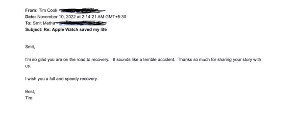 จากประสบการณ์ของ Metha เขาจึงได้ส่งอีเมลถึง Tim Cook ประธานบริหารของ Apple โดยตรง เนื้อหาเล่าถึงประสบการณ์ Apple Watch ช่วยชีวิตเขาได้ เพราะเขาสามารถโทรออกไปยังสายสำคัญได้