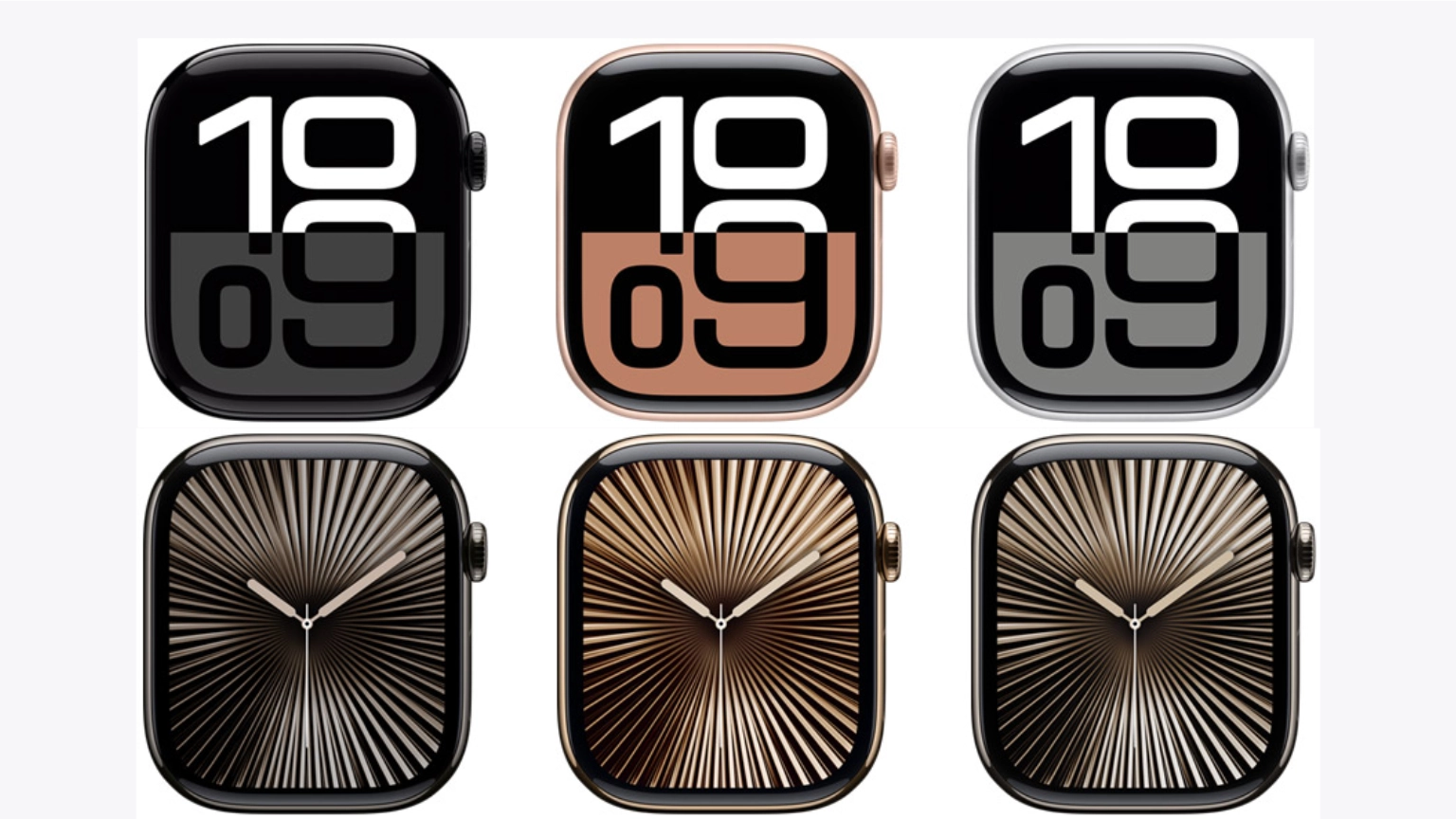 นับเป็นครั้งแรกที่ Apple Watch มาในผิวสัมผัสอะลูมิเนียมแบบขัดเงาในสีดำเจ็ทแบล็คที่ทั้งแวววาวและเปล่งประกายเงางาม ซึ่งการจะทำให้แวววาวได้ขนาดนี้ ตัวเรือนอะลูมิเนียมต้องได้รับการขัดเงาด้วยอนุภาคขนาดนาโน ต่อด้วยกระบวนการชุบผิวถึง 30 ขั้นตอน Apple Watch Series 10 ยังมาในแบบอะลูมิเนียมสีโรสโกลด์ใหม่และแบบอะลูมิเนียมปัดเงาสีเงินยอดนิยมด้วย