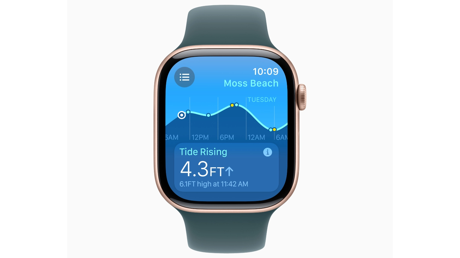 ซึ่งรวมถึงข้อมูลน้ำขึ้นและน้ำลงเต็มที่ ช่วงน้ำขึ้นและน้ำลง ระดับความสูงและทิศทางของน้ำขึ้นน้ำลง ตลอดจนช่วงเวลาที่ดวงอาทิตย์ขึ้นและดวงอาทิตย์ตก โดยข้อมูลทั้งหมดนี้จะมีการแสดงเทียบกับไทม์ไลน์ นอกจากนี้ยังสามารถดูชายหาดใกล้ๆ ตำแหน่งของตนบนแผนที่ได้อย่างสะดวก และกลไกหน้าปัดใหม่จะแสดงข้อมูลระดับน้ำขึ้นน้ำลง ณ สถานที่โปรดหรือชายหาดที่ใกล้ที่สุดให้มองเห็นได้ง่ายๆ เพียงแค่เหลือบมอง